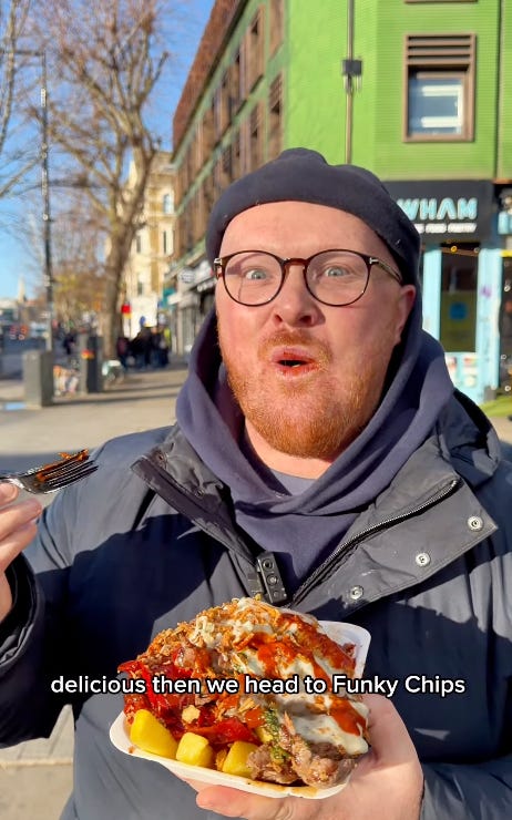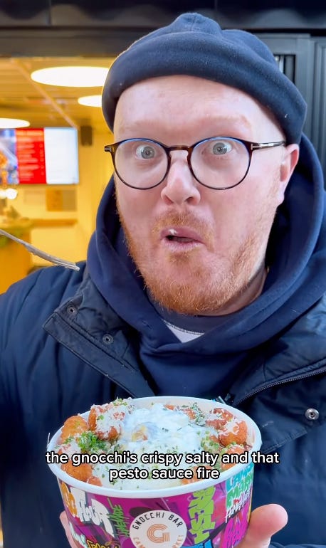 Eating with Tod is the biggest offender, but he’s more a symptom than a cause. Everything is video now, and what plays on Reels and TikTok are exaggerated reactions played for immediate serotonin hits. Viral food + dumb face = views. It’s a formula that keeps the influencer industry lumbering along, even as the uniformity of the reactions whittles away the returns with each view.